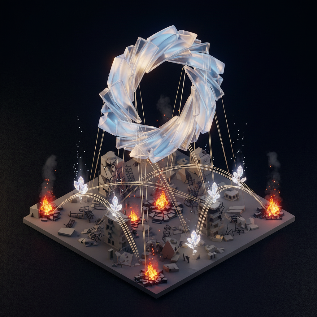 A luminous crystalline ring hovers above a miniature landscape of urban ruins and glowing embers.